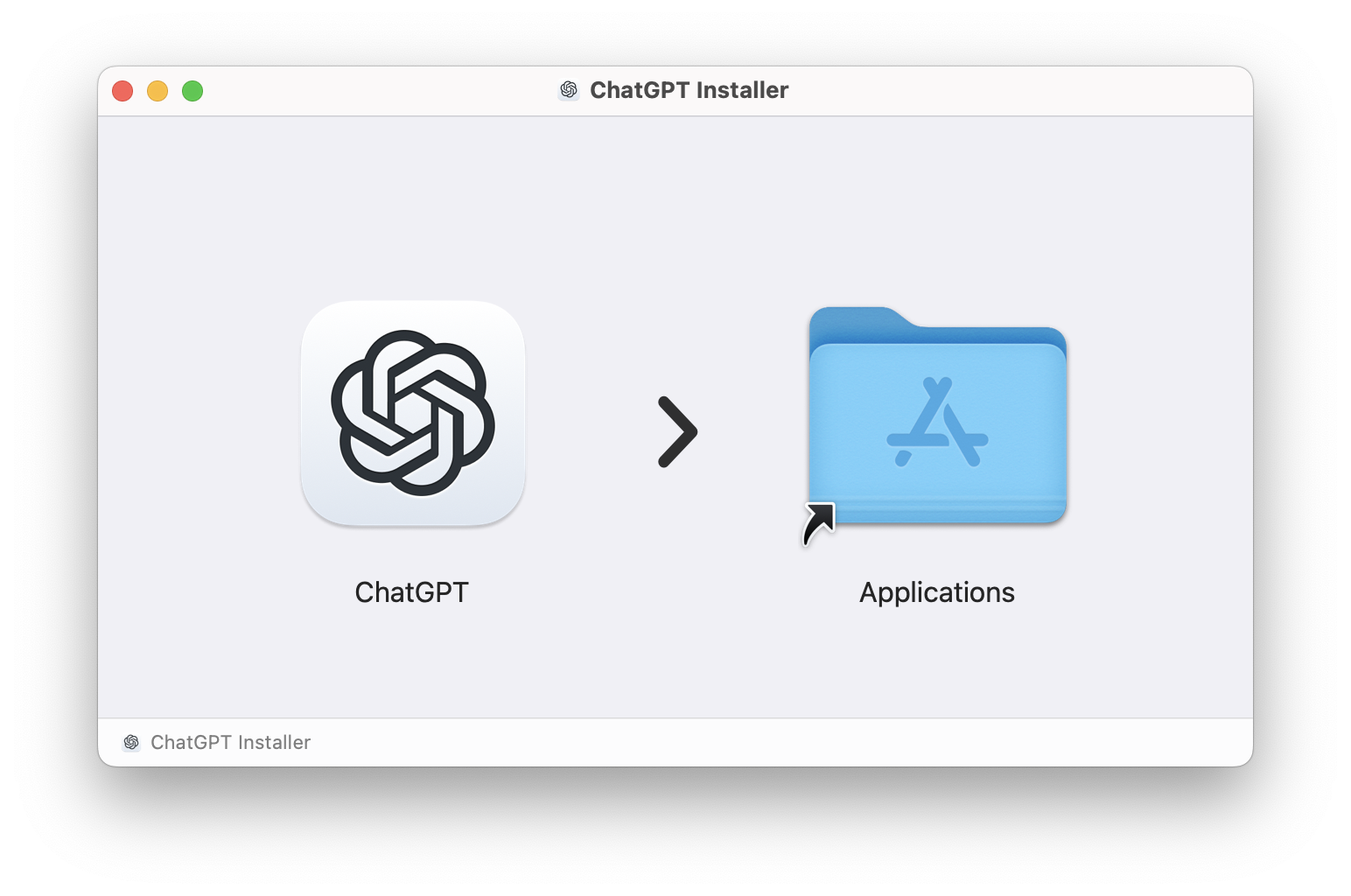 Sur le site de ChatGPT, OpenAI propose de télécharger une image disque (DMG). À l’intérieur, il y a le logiciel et un raccourci vers le dossier Applications du Mac. Il suffit de glisser ChatGPT dans le dossier pour l’installer (malheureusement, l’application n’est pas disponible sur l’App Store).