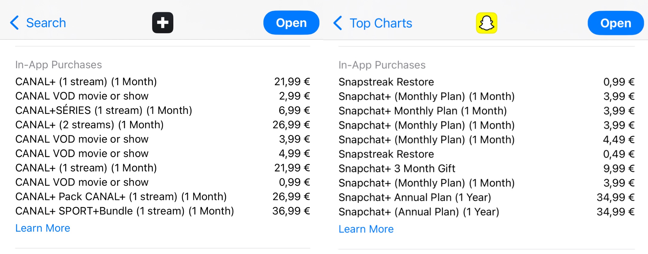 Pour avoir le droit de vendre du contenu dans son application, X doit déclarer à Apple, comme les autres développeurs, des « achats intégrés ». Les prix ne sont pas les mêmes sur l’App Store et sur le site web de X, puisqu’Apple prélève une commission de 30 % sur tous les achats. C’est pour cette raison qu’il oblige tous les développeurs à passer par son moteur de paiement s’ils souhaitent offrir des abonnements, avec l’obligation de créer une entrée différente pour chaque « produit » en vente.