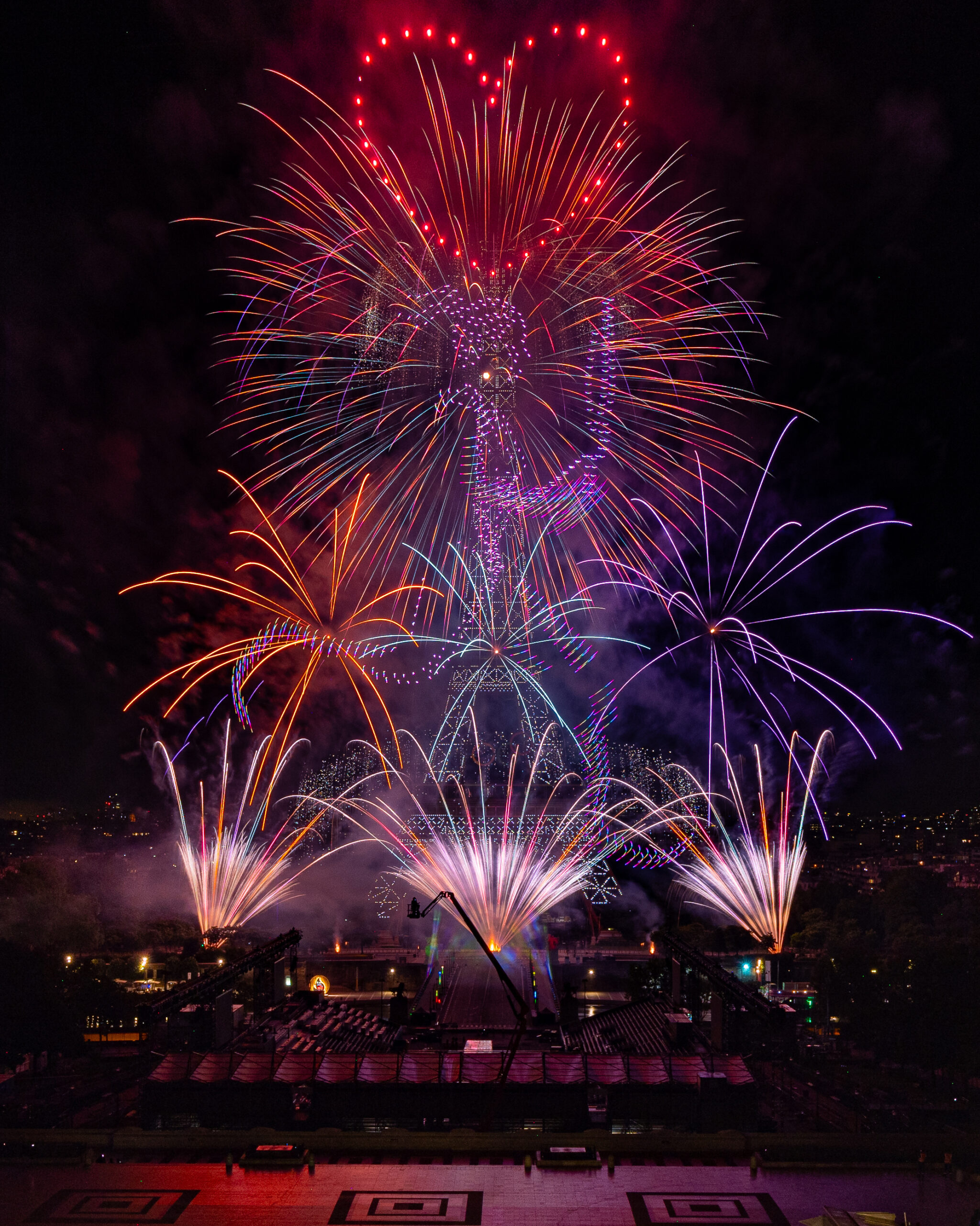 Ces drones étonnants sont ceux de Groupe F, une entreprise française spécialisée dans les feux d’artifices. « 1 100 drones ont décollé, qui emportaient une charge pyrotechnique. Ils faisaient leur chorégraphie en lumière, et larguaient à un moment donné la pyrotechnie accrochée en dessous », explique à Numerama Étienne Compain, directeur du programme drones de Groupe F. Le défi était grand : faire évoluer ce millier de drones pyrotechniques à seulement 100 mètres de la tour Eiffel, sur le pont d’Iéna, en volant à 247 mètres d’altitude.