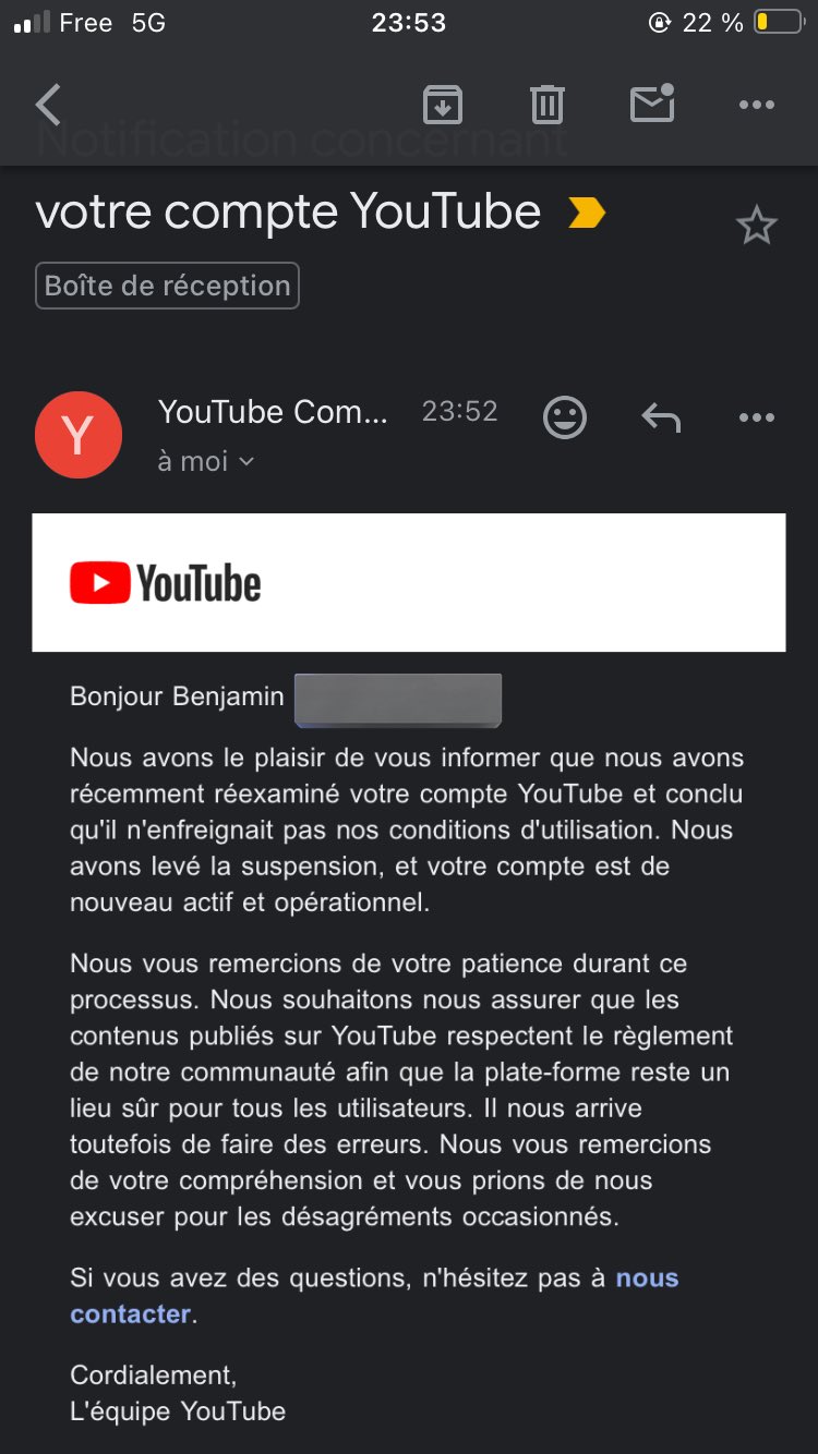 C’est le cas d’un certain Phenix, qui sur X a publié une capture d’écran du mail de YouTube indiquant que sa chaîne était de nouveau en ligne. La plateforme annonce avoir « le plaisir de vous informer que nous avons récemment réexaminé votre compte YouTube et conclu qu’il n’enfreignait pas nos conditions d’utilisation. Nous avons levé la suspension, et votre compte est de nouveau actif et opérationnel. » Plus de peur que de mal, donc.