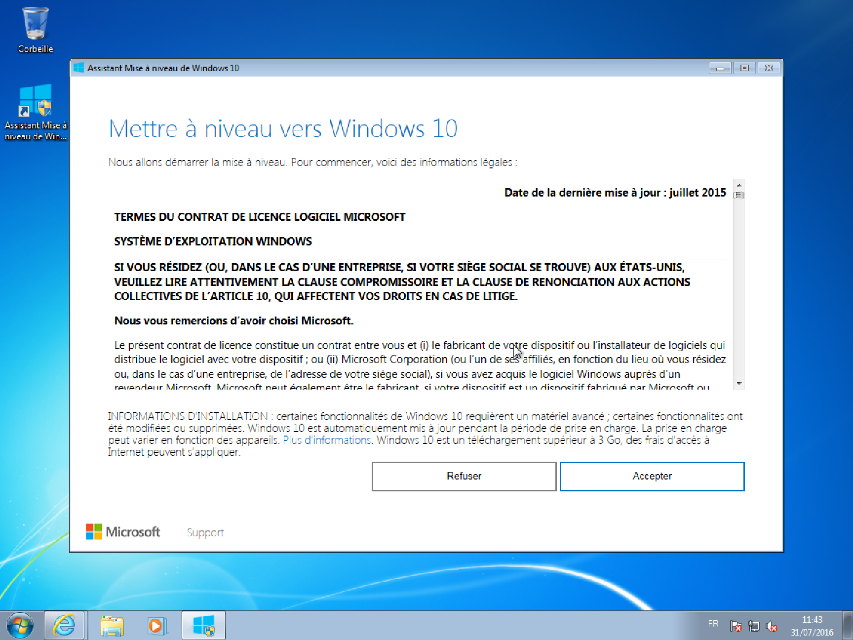 L’outil se charge ensuite d’évaluer la compatibilité de la machine avec Windows 10, puis de télécharger et installer le nouveau système. Aucune question n’est posée à l’utilisateur pendant la procédure, si ce n’est l’acceptation des nouvelles conditions d’utilisation de Windows. Aucune clé produit n’est nécessaire.