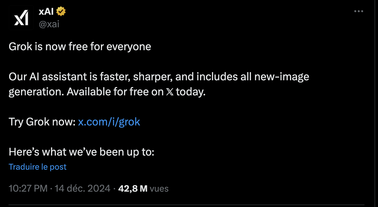 Durant sa première année d’existence, Grok était un produit payant. Elon Musk avait décidé de réserver son chatbot aux abonnés X Premium, la formule payante pour accéder à son réseau social X, notamment pour convaincre des personnes de s’y abonner. Le 14 décembre, xAI a annoncé un changement capital : Grok est désormais une intelligence artificielle gratuite.