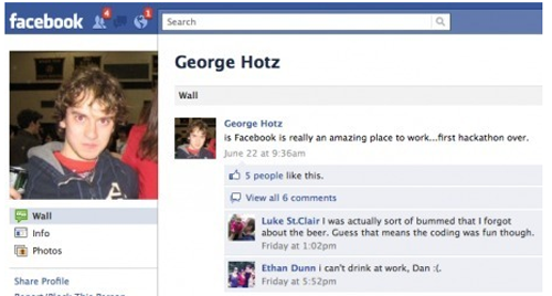 Article du 27 juin 2011 – Ca n’est pourtant pas la société où ses compétences reconnues en cryptographie et en hacking semblent pouvoir être les mieux exploitées. Mais George Hotz, mieux connu sous son pseudonyme GeoHot, travaillerait désormais pour Facebook. C’est un message publié sur son profil qui le laisse penser : « Facebook est vraiment un endroit formidable pour travailler« .