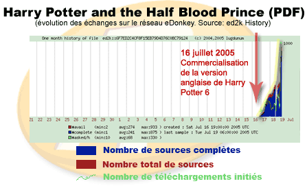 « Dans un effort conjoint les pirates [se sont rejoints] sur des salons IRC qui portent des noms imaginatifs tels que #pottermania ou #potterwork pour se répartir les tâches de numérisation et de relecture« , nous apprend Colin Dustan sur MobileRead Networks. Il n’aura fallu que douze heures de travail en commun pour que l’intégralité de l’ouvrage soit mise à disposition sur Internet. D’abord diffusé principalement sur des sites russes, l’ouvrage compilé au format PDF se répand maintenant à grande vitesse sur les réseaux P2P, comme en témoigne ce graphique tiré des statistiques eD2k History (l’outil de statistiques du réseau eDonkey/eMule fourni par le serveur Razorback) :