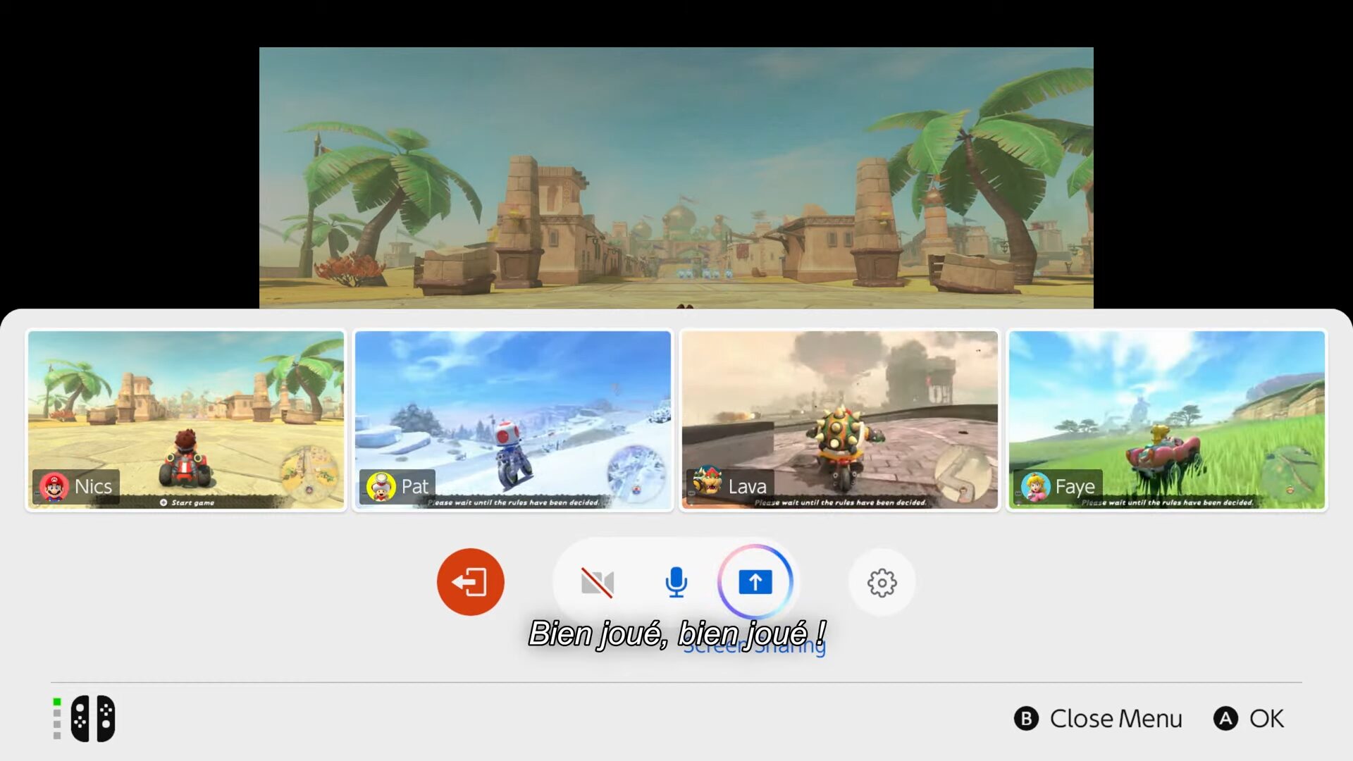 15h07 : On passe aux Joy-Con, avec le fameux bouton C. Il permet de lancer le mode GameChat, un système pour parler à des amis pendant qu’on joue. On utilise les micros de la console pour discuter, avec ses amis qui apparaissent à l’écran. Nintendo dit avoir mis en place des algorithmes pour isoler le son de la voix.