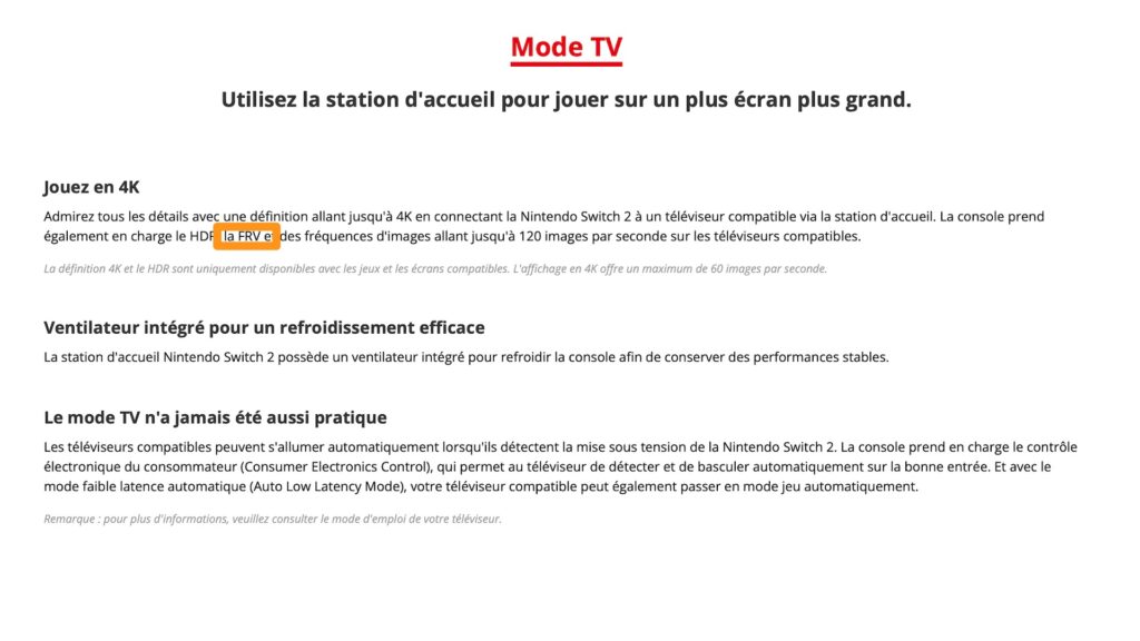 Numerama peut confirmer cette observation : la page française a également été revue pour ajuster les informations. Un petit passage par WaybackMachine appuie la découverte. Le 4 avril, on pouvait encore lire : « La console prend également en charge le HDR, la FRV et des fréquences d’images allant jusqu’à 120 images par seconde sur les téléviseurs compatibles. » Aujourd’hui, le terme FRV, ou VRR, a été retiré de cette phrase décrivant le mode TV de la Nintendo Switch 2.