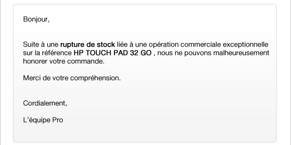 Ce jeudi après-midi, CDiscount a fait bien pire pour son image de marque, en envoyant un grand nombre d-e-mails d’annulation de commandes à ses clients qui avaient acheté le TouchPad mercredi.
