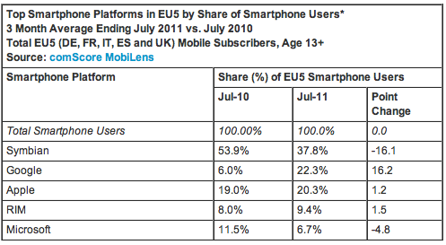 Le numéro un reste toujours Symbian, détenu par Nokia. Néanmoins, le système qui était utilisé par près de 54% des possesseurs de smartphone en 2010 ne l’est plus que par 38% des Européens. La chute de 16 points est vertigineuse, mais pas étonnante lorsque l’on sait que Nokia privilégie désormais Windows Phone 7 pour ses appareils. Plus inquiétant pour le Finlandais, le système d’exploitation de Microsoft perd lui aussi près de 5 points, passant de 11.5% d’utilisateurs à seulement 6,7%, confirmant la perte de vitesse du constructeur européen dans les téléphones haut de gamme.