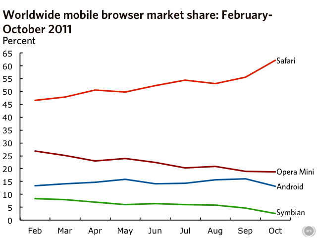 Du côté des navigateurs mobiles, Internet Explorer est quasiment inexistant et ne représente que 0,16% du marché, derrière Opéra Mobile et ses 0,49%. C’est Safari Mobile, le navigateur équipant les iPhone et les iPad qui rafle la mise avec 62,17% des parts de marché. Opera Mini arrive deuxième avec 18,65% et le navigateur équipant par défaut les appareils Android séduit 13,12% des mobinautes. La navigateur d’Apple enregistre une hausse de 6,58 points par rapport à septembre.