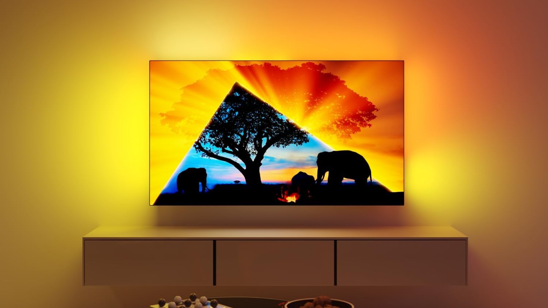 Signe distinctif de Philips : l’Ambilight 3 côtés. Ce système projette des halos lumineux colorés derrière l’écran, synchronisés avec ce qui se passe à l’image ou au son (plein de paramètres sont disponibles).