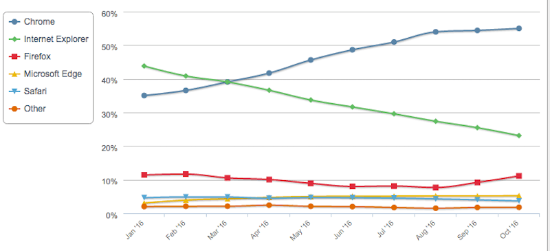 C’est Google Chrome qui, aujourd’hui, est en train de s’établir progressivement comme le leader des navigateurs, suivi par Firefox, tandis que IE et Edge sont en train d’être abandonnés par tout le monde.