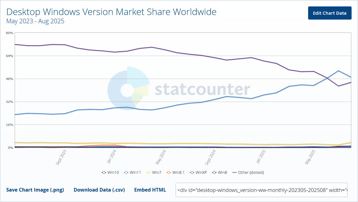 Mais ce recul ne s’est pas fait à un tempo assez rapide. Résultat, en août 2025, on compte encore 45,53 % d’ordinateurs sous Windows 10, soit quasi un PC Windows sur deux en circulation. Et cela, rappelons-le, à un mois de la date fatidique qui actera l’arrêt de toute assistance technique gratuite, sans patch et sans évolution.