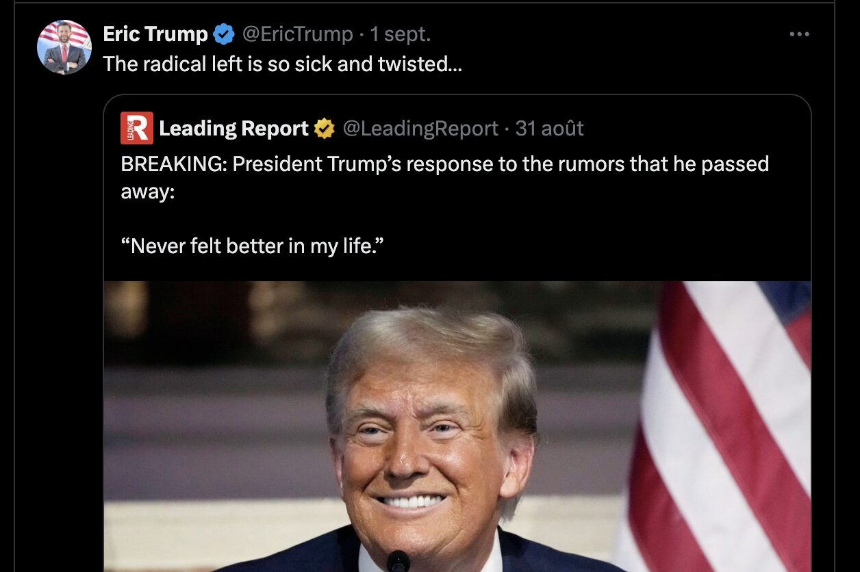 Selon Newsweek, des centaines de milliers de posts sur la mort de Donald Trump ont été partagés durant le week-end, avec des vidéos TikTok cumulant même plusieurs millions de vues. Le président américain a lui-même réagi à la rumeur sur Truth Social le 31 août en indiquant : « Je ne me suis jamais senti mieux de ma vie ». Une publication que les complotistes pensent écrite par ses proches, qui dissimuleraient son véritable état de santé.