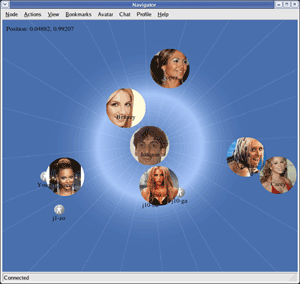 – les « services ». Il est possible de rajouter librement des services de communication et d’interactions sur le « navigator ». On peut imaginer beaucoup de services. Pour l’instant, nous avons implémenté des services basiques : chat (communication inter-personnelle) et échange d’avatars (échange de fichiers). Nous travaillons actuellement sur un service « profile » permettant de partager des fichiers, faire des recherches, tenir un blog et donner quelques informations personnelles (c’est en pré-beta également).