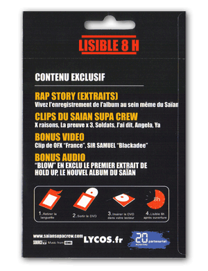 Un simple carton coloré de 18,5 x 13cm. Quelques grammes, un recouvrement plastifié… et des pointillés pré-découpés sur la partie haute du carton nous invitent à le déchirer. Mais « ATTENTION : Ce DVD s’autodétruira 8 heures après ouverture« . Nous voilà prévenus. Ambiance Mission : impossible, pour ce packaging qui recouvre le DVD promotionnel du groupe Saïan Supa Crew.