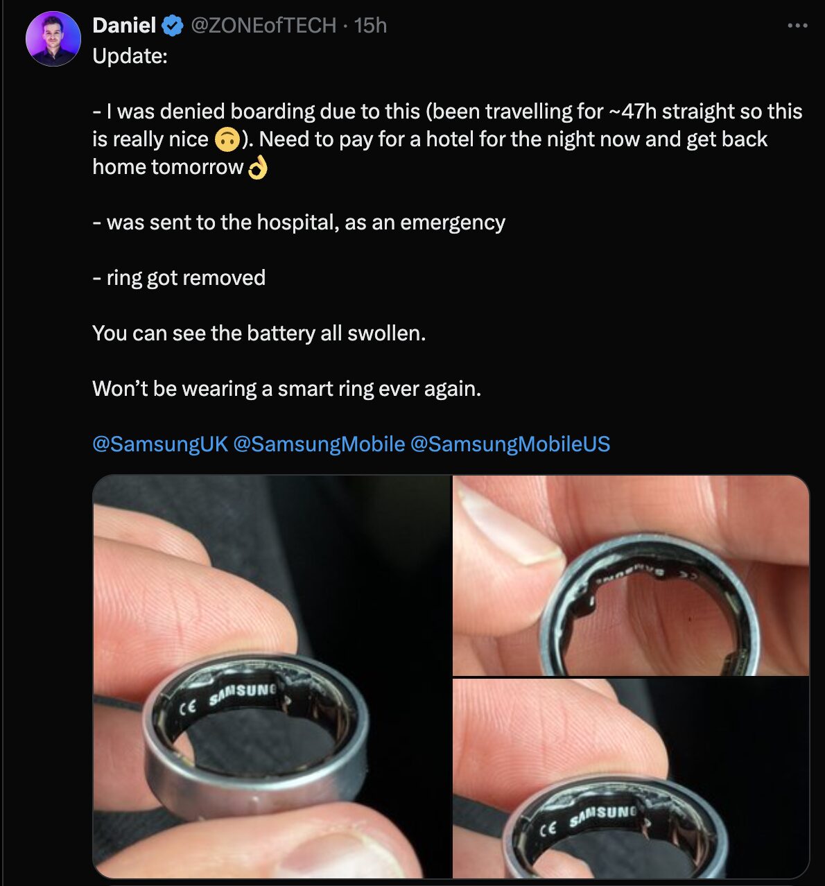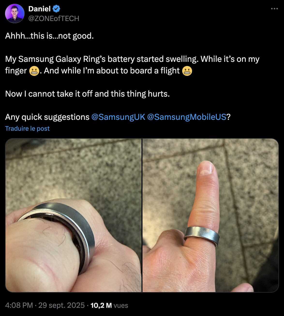 Sur X, un message partagé par Daniel, le créateur derrière la chaîne YouTube ZONEofTECH, risque d’alerter Samsung. Le 29 septembre, le jeune homme s’est retrouvé piégé alors qu’il s’apprêtait à embarquer dans un avion. Sa bague Samsung Galaxy Ring a soudainement gonflé de manière très préoccupante au niveau de la batterie. Une situation d’autant plus problématique que la bague ne pouvait plus être retirée, ce qui signifie qu’un gonflement plus fort aurait sérieusement pu endommager son doigt.