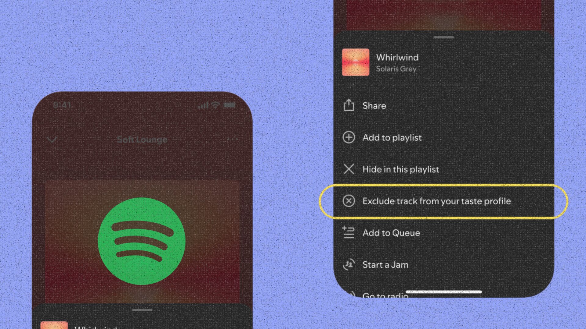 Jusqu’ici, la plateforme de streaming musical permettait seulement d’exclure des playlists personnalisées. Désormais, il sera possible d’écarter un morceau précis de l’algorithme. Cette action « réduira l’impact des diffusions passées et futures de cette chanson sur vos recommandations », explique Spotify.