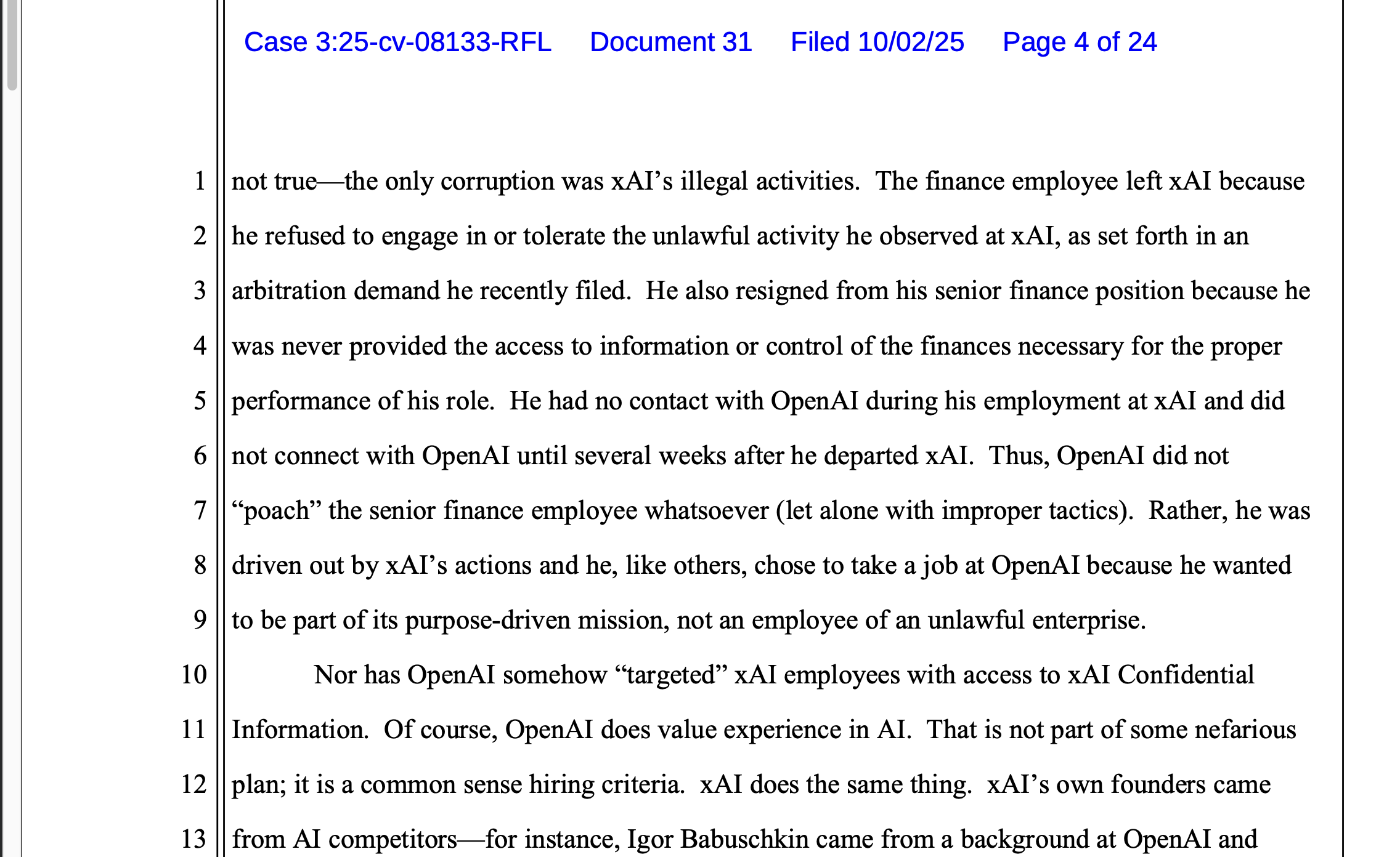 Il est, par exemple, indiqué qu’un ancien cadre financier senior de xAI a quitté l’entreprise non pas pour rejoindre OpenAI sur la base d’un quelconque « arrangement corrompu » ou pour transmettre des informations confidentielles, mais à cause de ce qu’il considérait comme des « activités illégales » observées chez xAI. L’employé en question n’aurait rejoint OpenAI que plusieurs semaines après son départ.