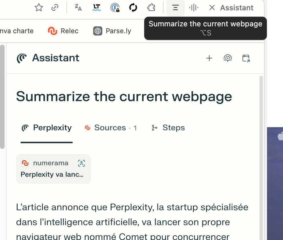 Selon Perplexity, Comet est le premier navigateur de l’ère des « agents IA ». Entendez par là que Perplexity intègre plusieurs fonctions natives, comme des boutons pour résumer une page web ou appeler l’assistant. Perplexity s’ouvre alors dans une barre latérale, sans remplacer la page web en cours de visionnage.