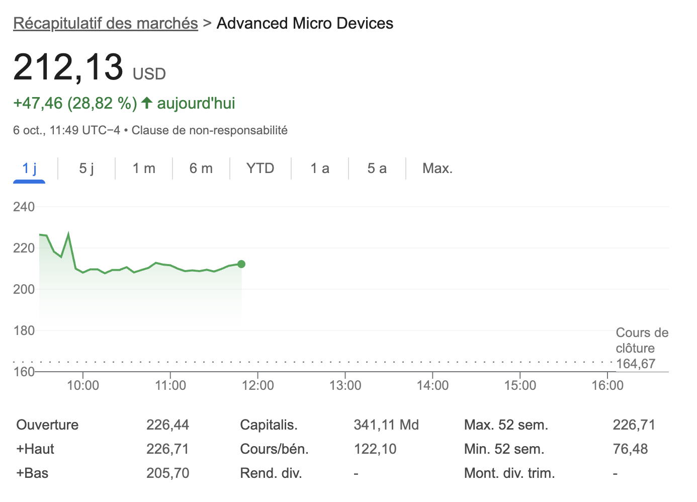 OpenAI est-il un faiseur d’or ? L’annonce de son partenariat avec AMD a eu effet spectaculaire sur la bourse : l’action AMD s’est envolée de plus de 30 % juste avant l’ouverture de Wall Street, avant de se lisser autour des 28 %.