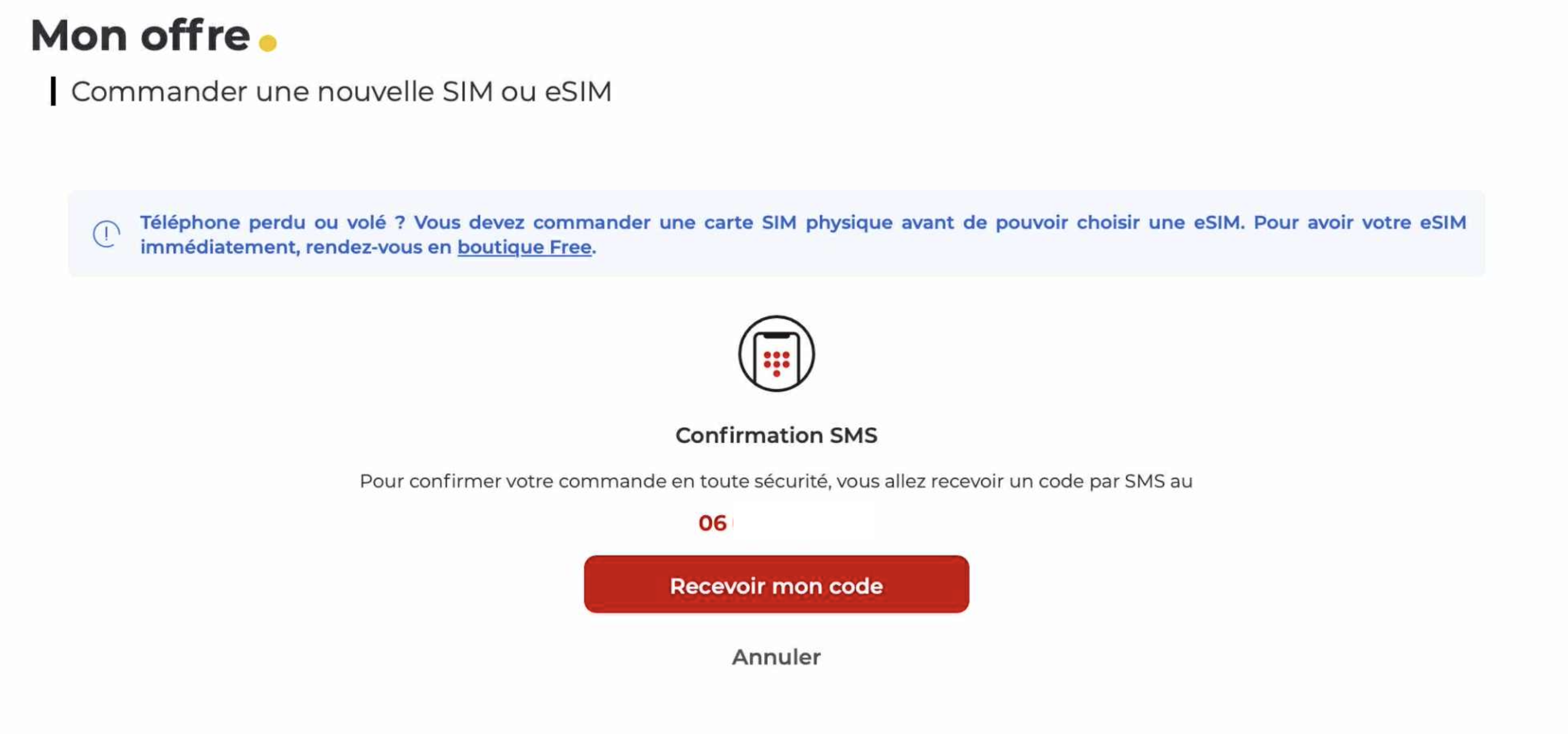 Comme chez Orange, Free Mobile exige un code reçu par SMS pour demander une nouvelle eSIM, qu’il facture 10 euros. Impossible donc de le faire à distance : Free ne peut pas vérifier l’identité (fun fact : l’opérateur permet quand même de bloquer son ancienne eSIM en cas de vol durant cette procédure de renouvellement, mais demande ensuite un code par SMS pour valider).