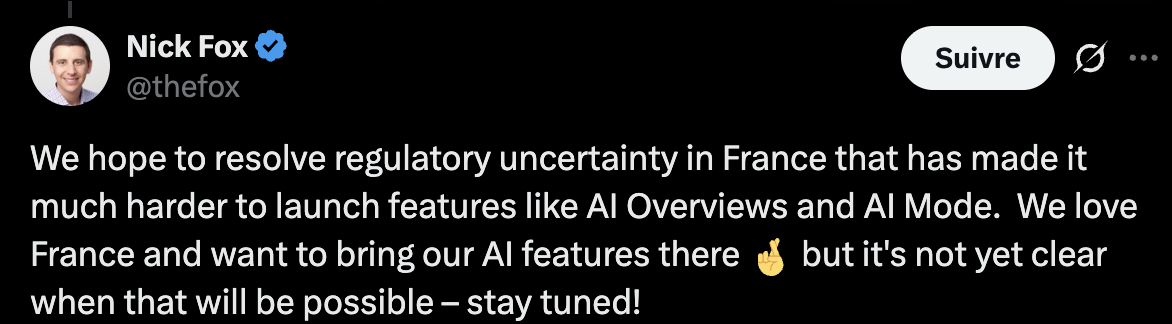Mise à jour 14h : Nick Fox, le patron de Google Search, a répondu à un Français curieux de connaître la raison du blocage en France. « Nous espérons résoudre l’incertitude réglementaire en France, qui a rendu beaucoup plus difficile le lancement de fonctionnalités comme les Aperçus IA et le AI Mode. Nous aimons la France et souhaitons y déployer nos fonctionnalités d’IA mais nous ne savons pas encore quand cela sera possible – restez connectés ! ». Il fait référence aux accords signés par Google en France, qui empêchent le lancement de fonctionnalités du genre.