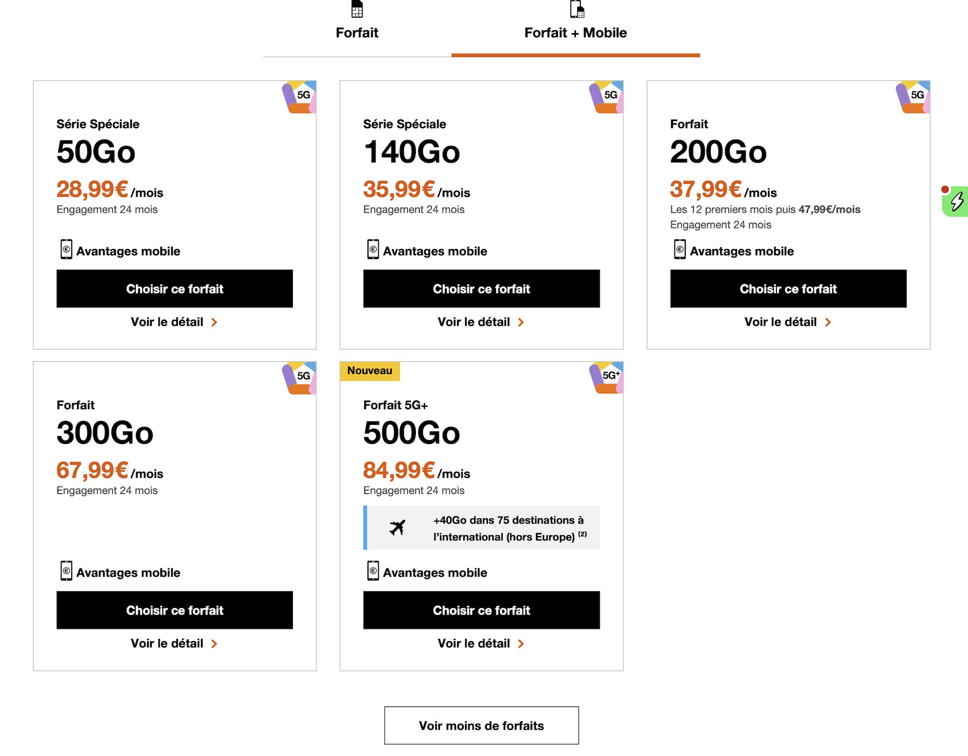 Orange a décidé de muscler son offre mobile la plus chère. Les personnes ayant besoin d’une enveloppe de données astronomique ont désormais la possibilité de s’engager pour un forfait 500 Go en 5G+, autrefois limité à 410 Go. Le prix pique forcément : 84,99 € par mois, avec un engagement de deux ans (69,99 € si déjà client Internet). C’est bien évidemment un record pour l’opérateur.