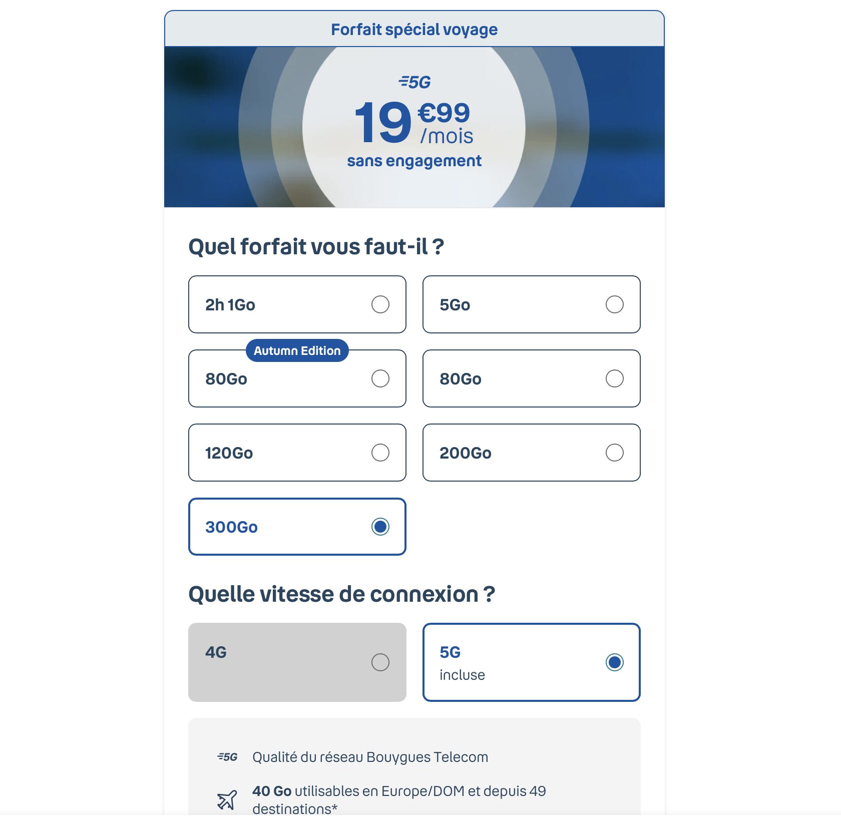 Pour le remplacer, Bouygues mise sur une offre un peu plus haut de gamme. L’opérateur lance le « Forfait spécial voyage » à 19,99 euros par mois. À ce prix, l’opérateur propose 300 Go en France et « 40 Go en Europe/DOM et depuis 49 destinations ».