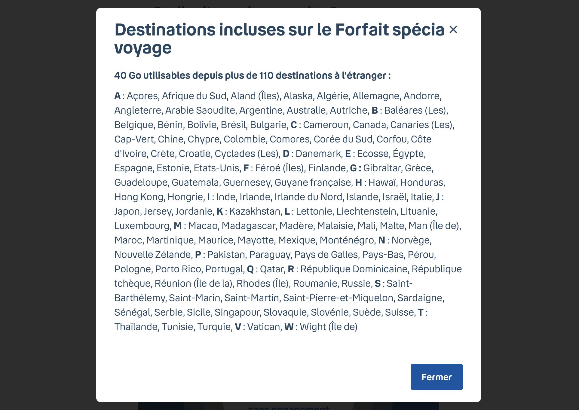 Sur son site, Bouygues communique la liste des destinations incluses, qui mélange les « 49 destinations » hors Europe et celles obligatoires dans l’Union européenne. Il y a au total 110 destinations, dont l’Arabie Saoudite et l’Île Maurice, que les autres n’ont pas.