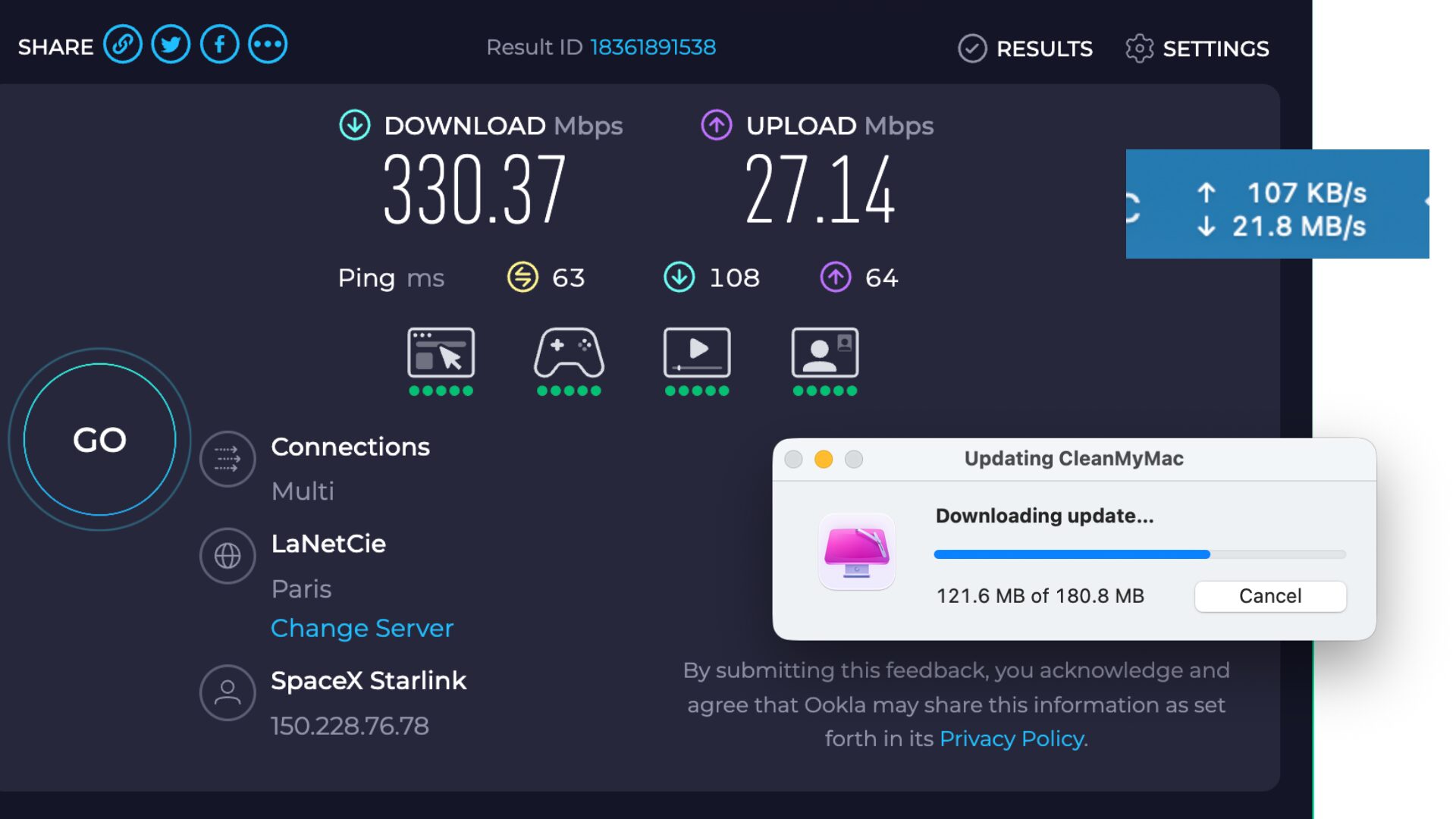 Grâce à Starlink, les avions ne se connectent plus à des antennes à 36 000 km d’altitude, mais à la constellation de 10 000 satellites d’Elon Musk, située à 550 km de hauteur. La différence est phénoménale : on s’approche des débits de la fibre, avec une latence entre 20 et 60 ms la plupart du temps. Tous les satellites sont récents : il n’y a plus de disparité d’une zone à une autre. Autre avantage : il y a des satellites partout, le réseau est garanti sur toute la planète (ou presque, mais un autre satellite devrait rapidement arriver).