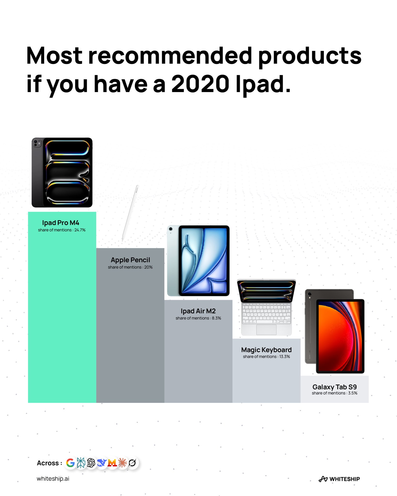 Pour notre première requête, nous avons choisi de prendre le rôle d’un acheteur qui souhaite faire évoluer son iPad acheté il y a 5 ans. Whiteship a trouvé que la recommandation des différentes IA met en première place un iPad Pro M4 et tout de suite après, un Apple Pencil. On aurait effectivement pu faire la même recommandation : acheter un iPad Pro de dernière génération permet de voir venir les 5 prochaines années (notez : l’iPad Pro M5 n’était pas sorti au moment de la requête).