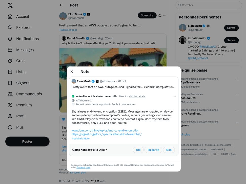 Si les choses ont fini par rentrer dans l’ordre assez rapidement, et qu’un long message technique d’AWS a permis d’exposer les causes de cette grosse sortie de route, une polémique a cependant rejailli sur Signal le jour même de la panne. Une controverse notamment incarnée par Elon Musk, le propriétaire de X (ex-Twitter), qui a lancé une charge contre l’application.