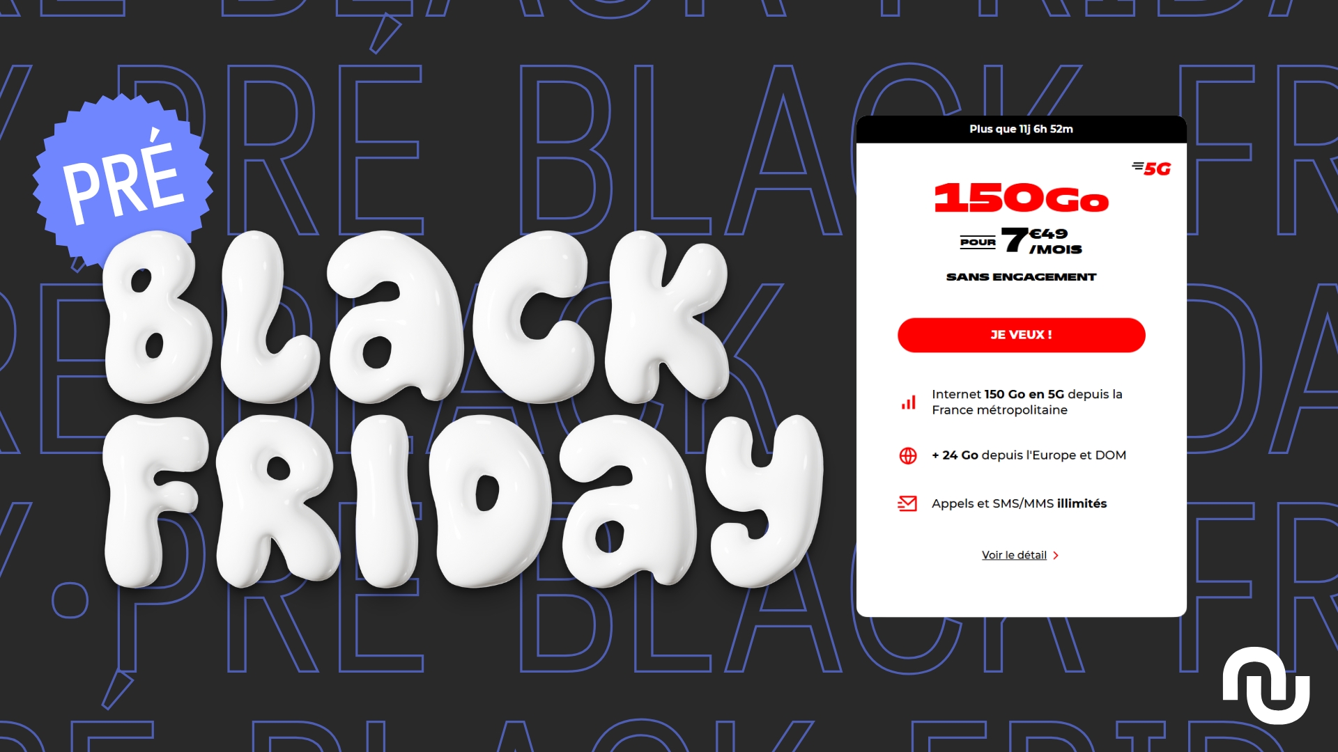 Un excellent rapport data/prix pour ce forfait 150 Go en 5G proposé par un NRJ Mobile, un MVNO utilisant le réseau Bouygues Telecom. Pour 7,49 €/mois seulement jusqu’au 16 novembre, vous profitez d’une grosse enveloppe de data de 150 Go en 5G, des appels et SMS/MMS illimités en France, ainsi que de 24 Go utilisables depuis l’Europe et les DOM. L’offre est sans engagement, et la carte SIM est facturée 1 € seulement.