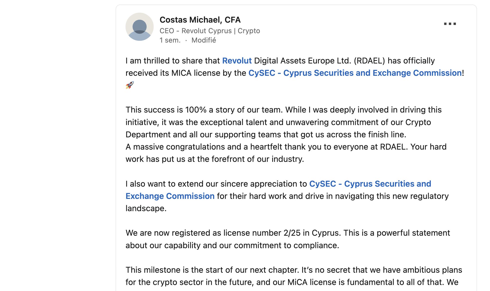 Cette licence ne s’appliquant qu’aux pays de l’EEE, des marchés comme la Suisse ou le Royaume-Uni en sont exclus. Dans un post publié sur LinkedIn, Costas Michael, CEO de Revolut Digital Assets Europe, a déclaré que « cette étape marque le début d’un nouveau chapitre. Ce n’est un secret pour personne : nous avons de grandes ambitions pour le secteur des crypto-actifs, et notre licence MiCA en est la pierre angulaire ».