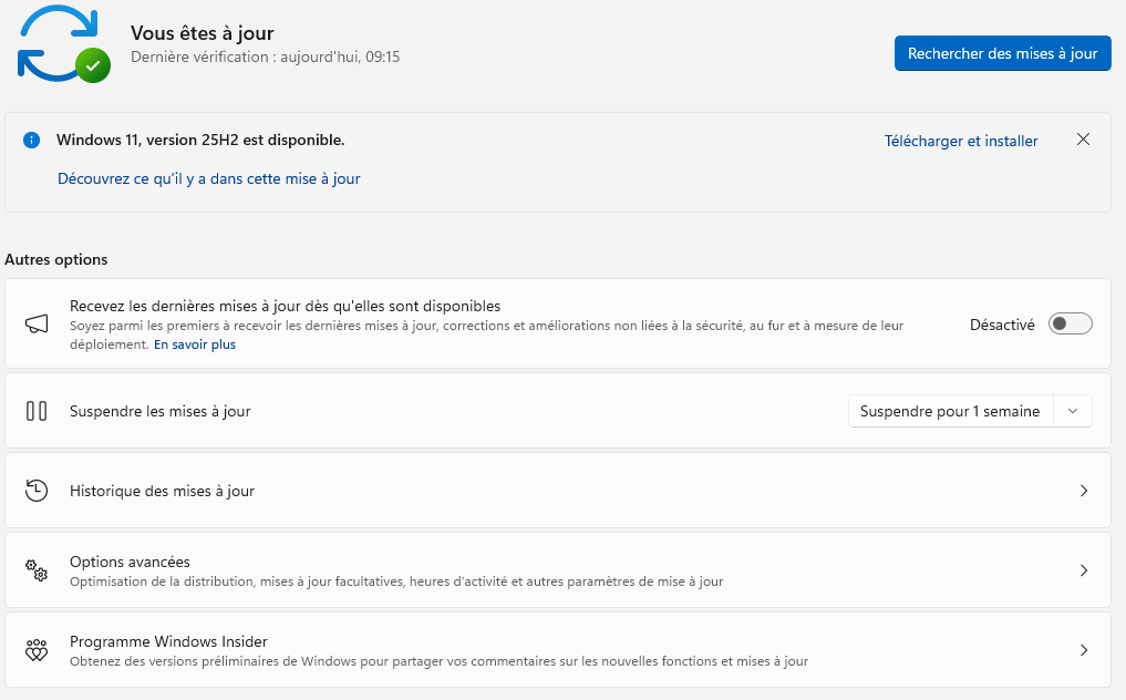 Si vous souhaitez déclencher la mise à jour manuellement, rendez-vous une fois encore dans le champ de recherche présent dans la barre des tâches de Windows 11 et inscrivez « update » et sélectionnez « vérifier les mises à jour ». Vous avez un bouton bleu « rechercher les mises à jour » et, possiblement, un encart annonçant la disponibilité de 25H2.