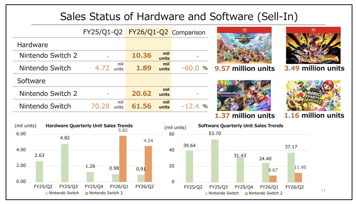 Durant le semestre avril-septembre, Nintendo a aussi vendu 61,56 millions de jeux Switch 1. C’est toujours Mario Kart 8 Deluxe, sorti en 2017, qui occupe la première place des ventes. Une anomalie dans le monde du jeu vidéo. Au trimestre prochain, Légendes Pokémon Z-A prendra sûrement la première place. Sans oublier EA Sports FC 26, enfin jouable sur une console Nintendo.