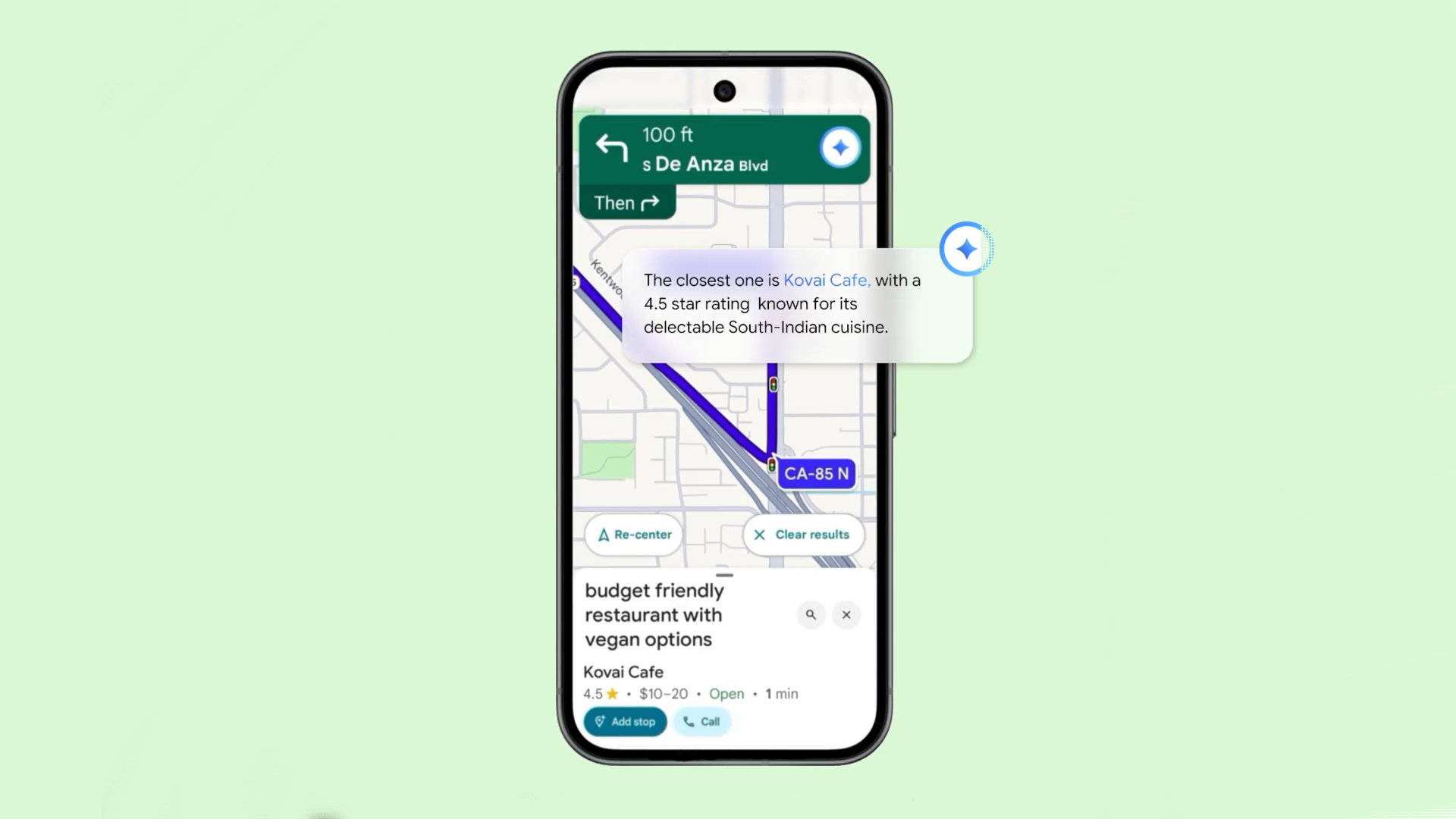 La première nouveauté est l’arrivée de Gemini directement dans Google Maps, à la place de Google Assistant. Le service de Google proposera les mêmes fonctions qu’ailleurs, mais avec des particularités dédiées à Maps. Il sera par exemple possible de lui demander la liste des restaurants que l’on croisera sur sa route, s’il est possible de faire un détour par tel endroit, s’il y a un chargeur pour son véhicule électrique, ou de partager son trajet avec un ami, le tout avec les mains sur le volant. Gemini peut ajuster un trajet en temps réel et faire des actions sur le smartphone. Google précise que Gemini va plus loin que son ancien assistant : il accepte des demandes précises comme « un restaurant abordable avec des options vegan à moins de deux kilomètres », par exemple.