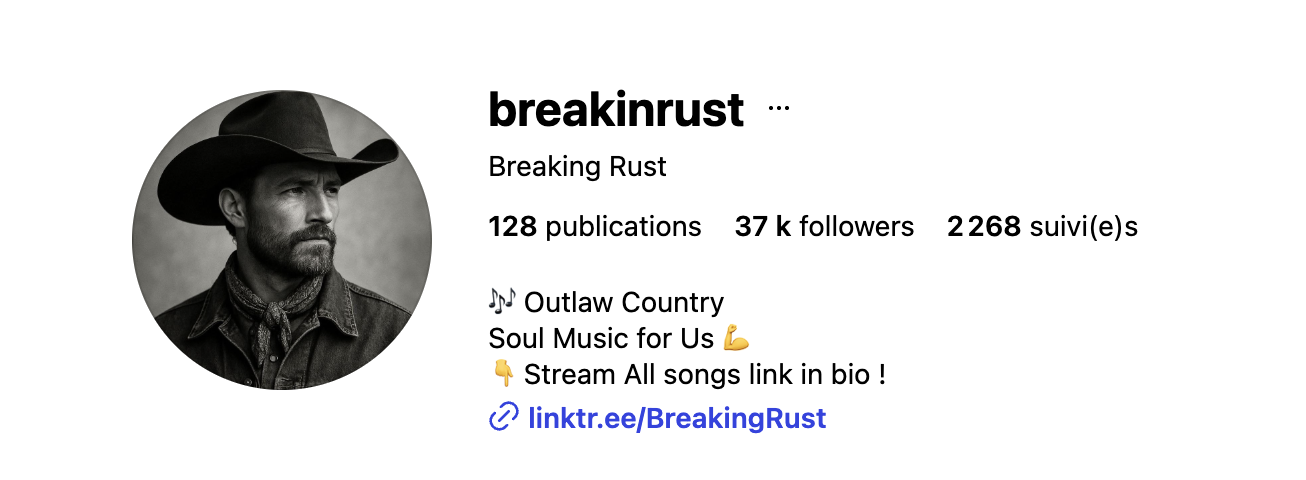 Présenté sur son Instagram comme un compte faisant de l’outlaw country, Breaking Rust alterne les créations en publiant des vidéos générées par IA et des morceaux de musique sur les plateformes. Sur Apple Music, son compte n’est pas du tout identifié comme un artiste IA et on peut donc croire que l’on a affaire à un véritable chanteur country d’une nouvelle génération — ce petit monde, plébiscité aux États-Unis évolue beaucoup depuis ses débuts et il n’y a pas que l’immense Johnny Cash dans les charts.