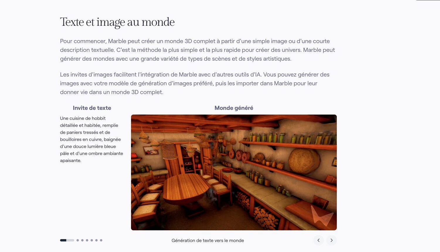World Labs est une jeune pousse américaine encore discrète, mais déjà très en avance dans son domaine. La société a été cofondée par Fei-Fei Li, figure majeure de l’IA moderne et pionnière de la vision par ordinateur. Leur idée : doter l’IA d’une véritable compréhension de l’espace en trois dimensions, pour qu’elle ne se contente plus de générer des images ou du texte, mais qu’elle fabrique des mondes. Marble, son modèle multimodal, est la pièce maîtresse de cette vision. Il s’agit d’un générateur de mondes 3D capable de produire des environnements complets — géométrie, textures, volumes, objets — à partir d’entrées très variées : un simple prompt textuel, quelques photos, une vidéo panoramique ou même un croquis de disposition spatiale. Sur son site, la firme donne un exemple : « Une cuisine de hobbit détaillée et habitée, remplie de paniers tressés et de bouilloires en cuivre, baignée d’une douce lumière bleue pâle et d’une ombre ambiante apaisante ».