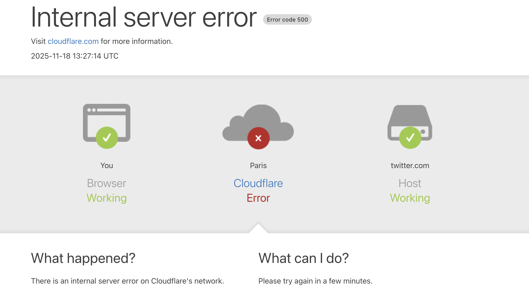 Une partie colossale du réseau Internet mondial est inaccessible, à cause d’une panne massive chez Cloudflare. Les internautes du monde entier se retrouvent face à des pages de chargement infinies ou des messages d’erreur fatidiques de type « 500 Internal Server Error ». L’incident touche aussi bien les réseaux sociaux que les plateformes de jeu ou les outils de travail collaboratif.