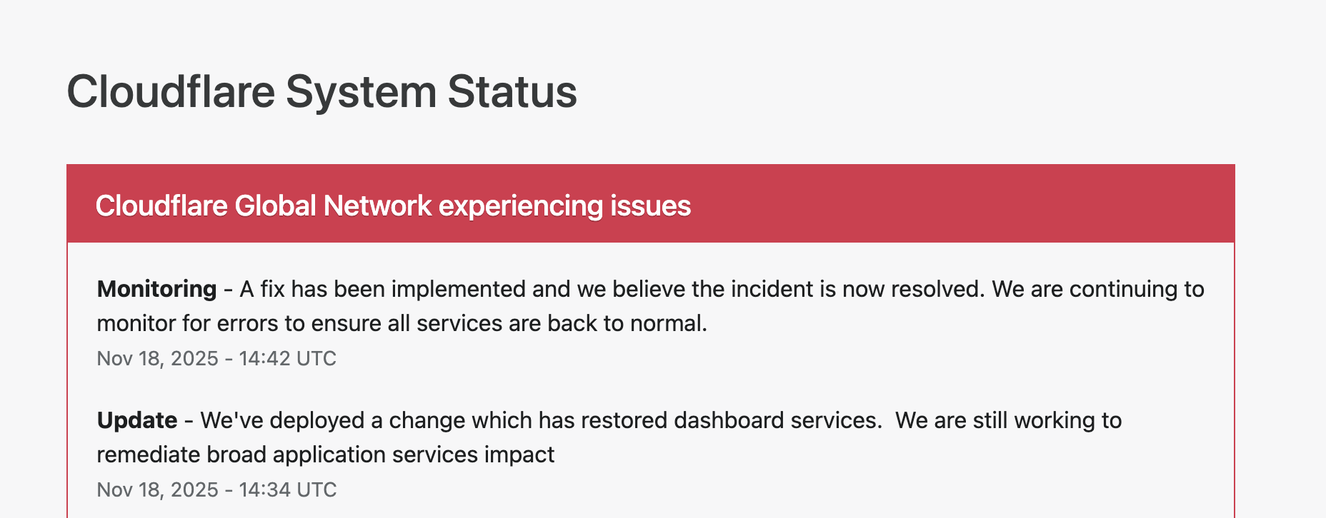 Après une restauration progressive des services vers 15 heures, Cloudflare a annoncé à 15h42 croire que l’incident était résolu. L’entreprise dit continuer de travailler pour s’assurer que tout continue de fonctionner.