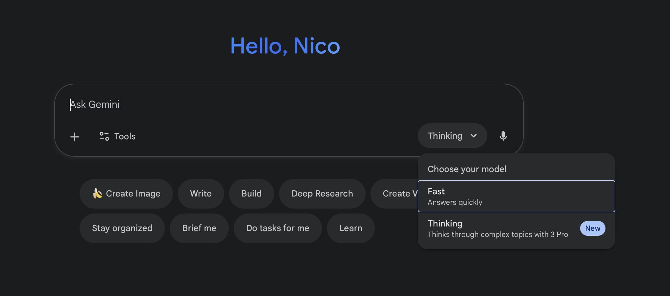 - Vérifiez le sélecteur de modèle : sélectionnez « Raisonnement/Thinking » ou « Gemini 3 Pro », pour bien basculer sur le nouveau modèle, si Google ne vous le propose pas automatiquement. Autrement, il s’agit de Gemini 2.5 Flash (« Fast )».