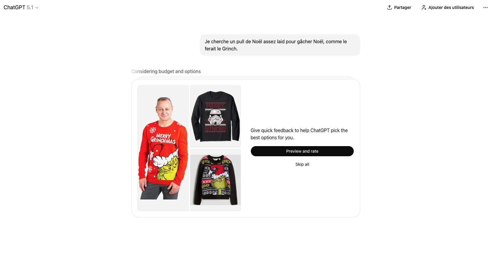 Trouver des cadeaux de Noël peut vite devenir un casse-tête. Bonne nouvelle : OpenAI pense avoir la solution. L’entreprise a annoncé le 24 novembre 2025 le déploiement de Shopping Research dans ChatGPT, une fonction censée vous aider à « trouver les produits qui vous conviennent ». Disponible sur mobile et web pour les abonnés Free, Go, Plus ou Pro, cette recherche d’achats bénéficie même d’une utilisation « quasi illimitée » pendant toute la période des fêtes.