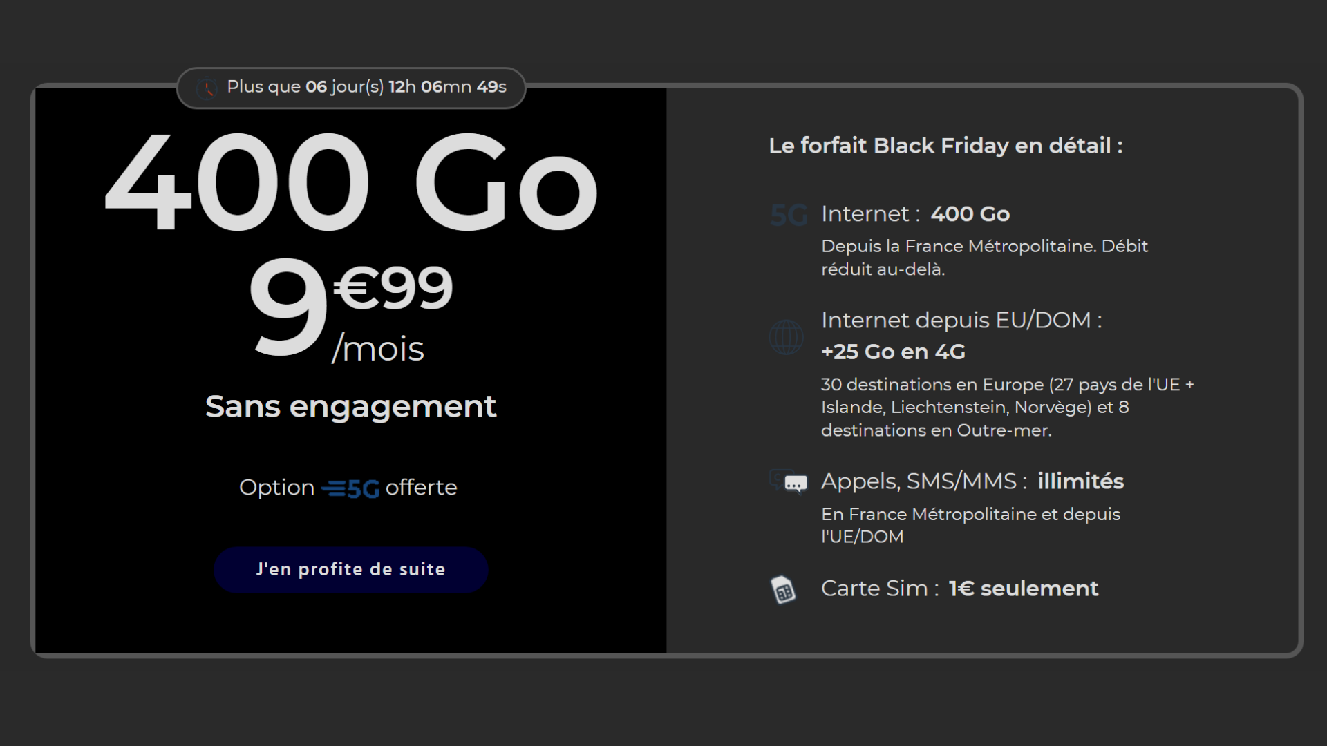 Cdiscount propose un forfait Black Friday avec 400 Go de données mobiles en 5G, au prix de 9,99 € sans engagement. L’offre est disponible jusqu’au 01 décembre 2025.