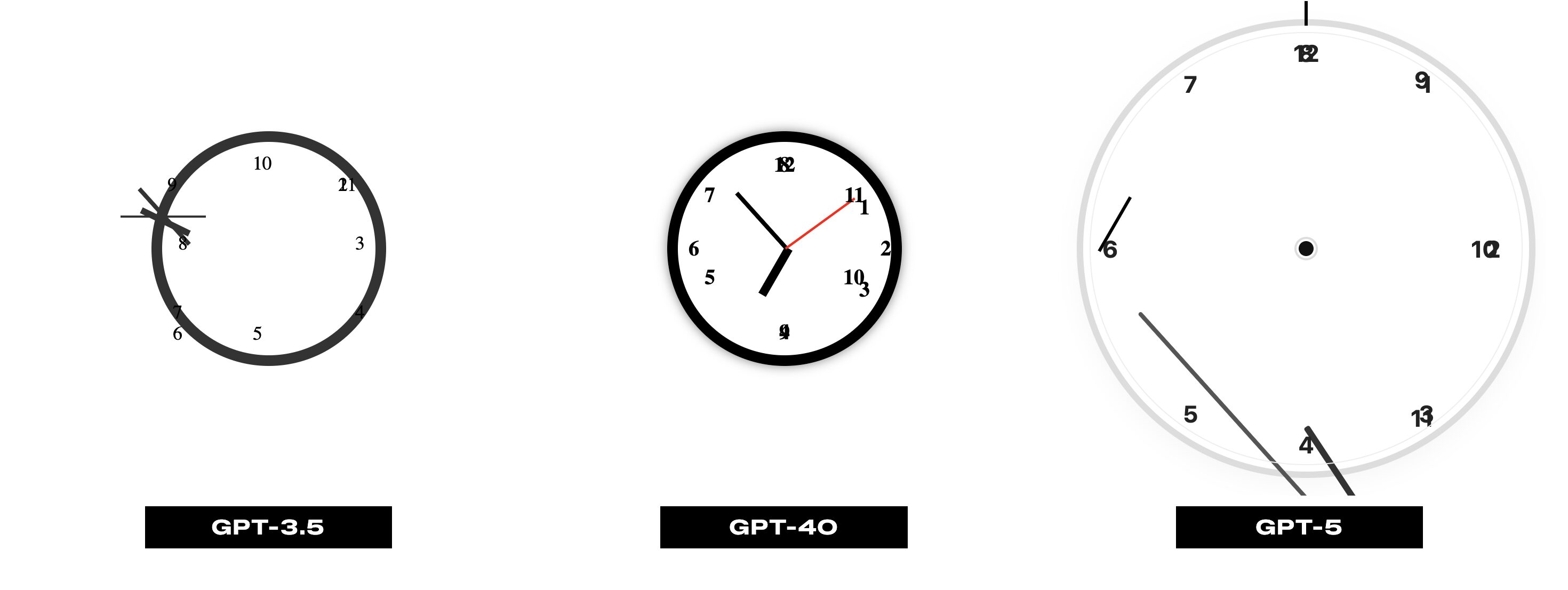 Autre fait assez amusant : sur les 10 générations que nous avons pu observer, GPT-5 s’en sort moins bien que son prédécesseur GPT-4o, tant sur l’exactitude que sur le design, proposant souvent des horloges complètement disproportionnées.