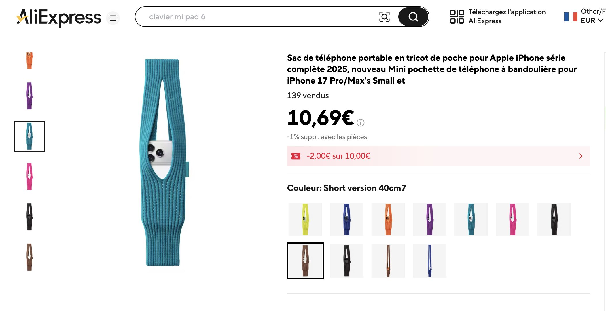 Une des annonces les plus populaires, avec plus de 140 ventes au moment de l’écriture de cet article, s’appelle : « Sac de téléphone portable en tricot de poche pour Apple iPhone série complète 2025, nouveau Mini pochette de téléphone à bandoulière pour iPhone 17 Pro/Max’s Small », quand une autre ne s’embête pas avec la propriété intellectuelle : « 2025 Nouveau pour iPhone Pocket par ISSEY MIYAKE 80 cm». Elles ne sont pas les seules sur AliExpress : plusieurs vendeurs proposent des iPhone Pocket à leur sauce.