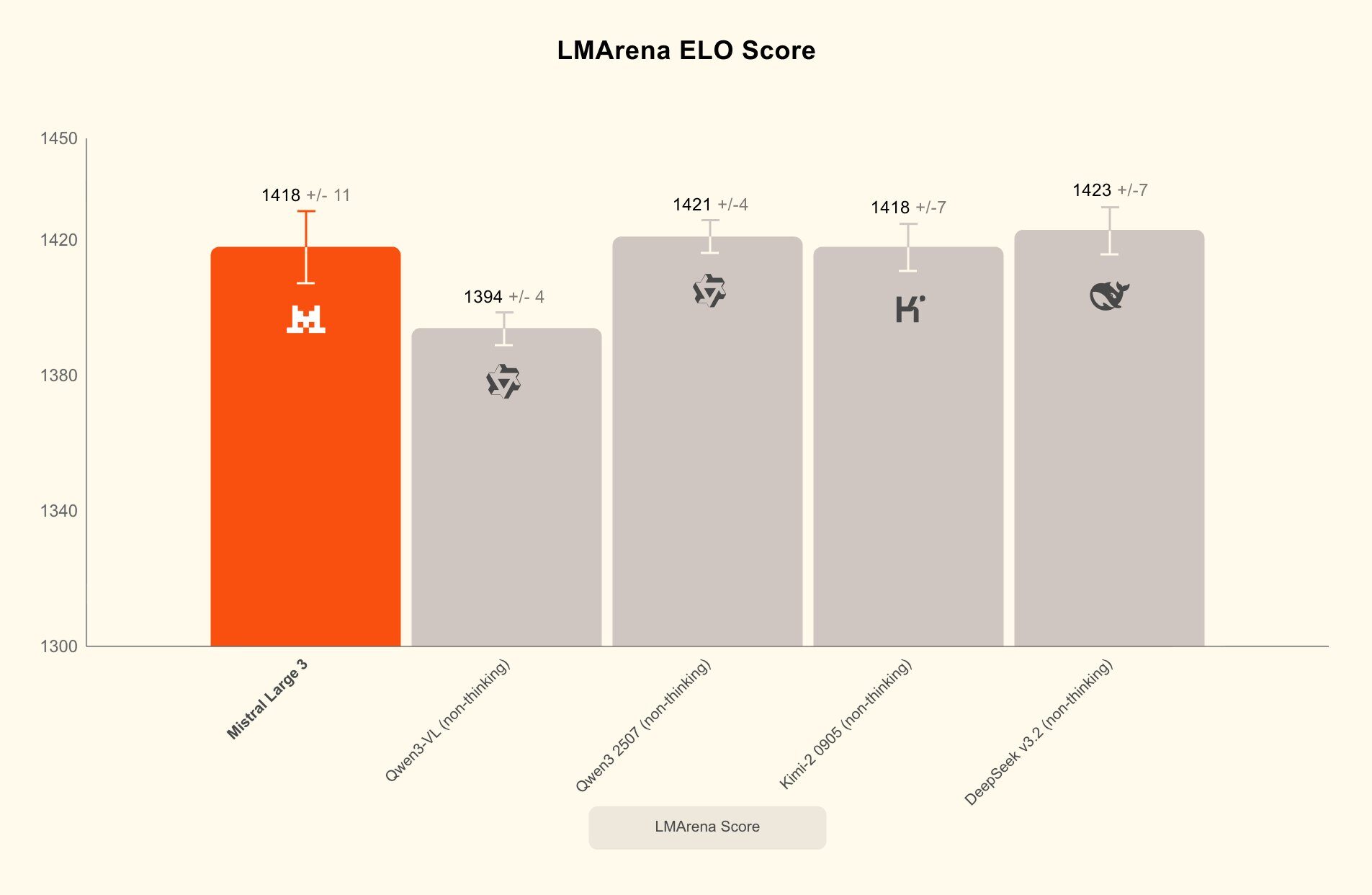 - Mistral Large 3 est le nouveau champion de Mistral AI. C’est un modèle avec une architecture Mixture-of-Experts (MoE), ce qui lui permet d’optimiser ses réponses sans solliciter trop de ressources d’un seul coup. Il totalise 675 milliards de paramètres n’en active que 41 milliards par token généré. Mistral indique qu’il se hisse à la 2ᵉ place mondiale des modèles open source sur LMArena (hors modèles de raisonnement pur), juste derrière DeepSeek.