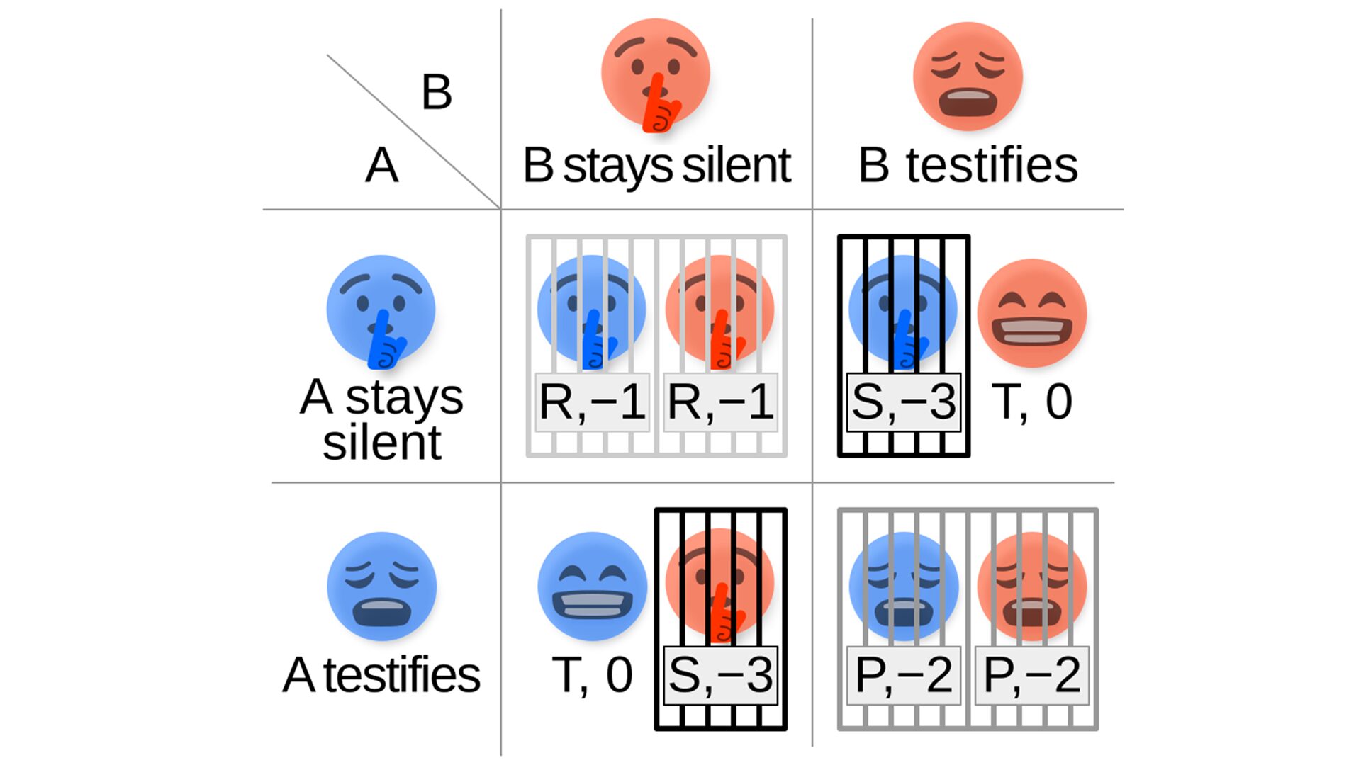 Dans ce cas de figure caractéristique de la théorie des jeux, il s’agit de faire une balance coût-bénéfice en se demandant comment réagira l’autre personne. L’idée étant que la coopération est la solution la plus raisonnable… Sauf au moment où l’un décide de trahir puisque c’est l’autre qui en paiera les frais.