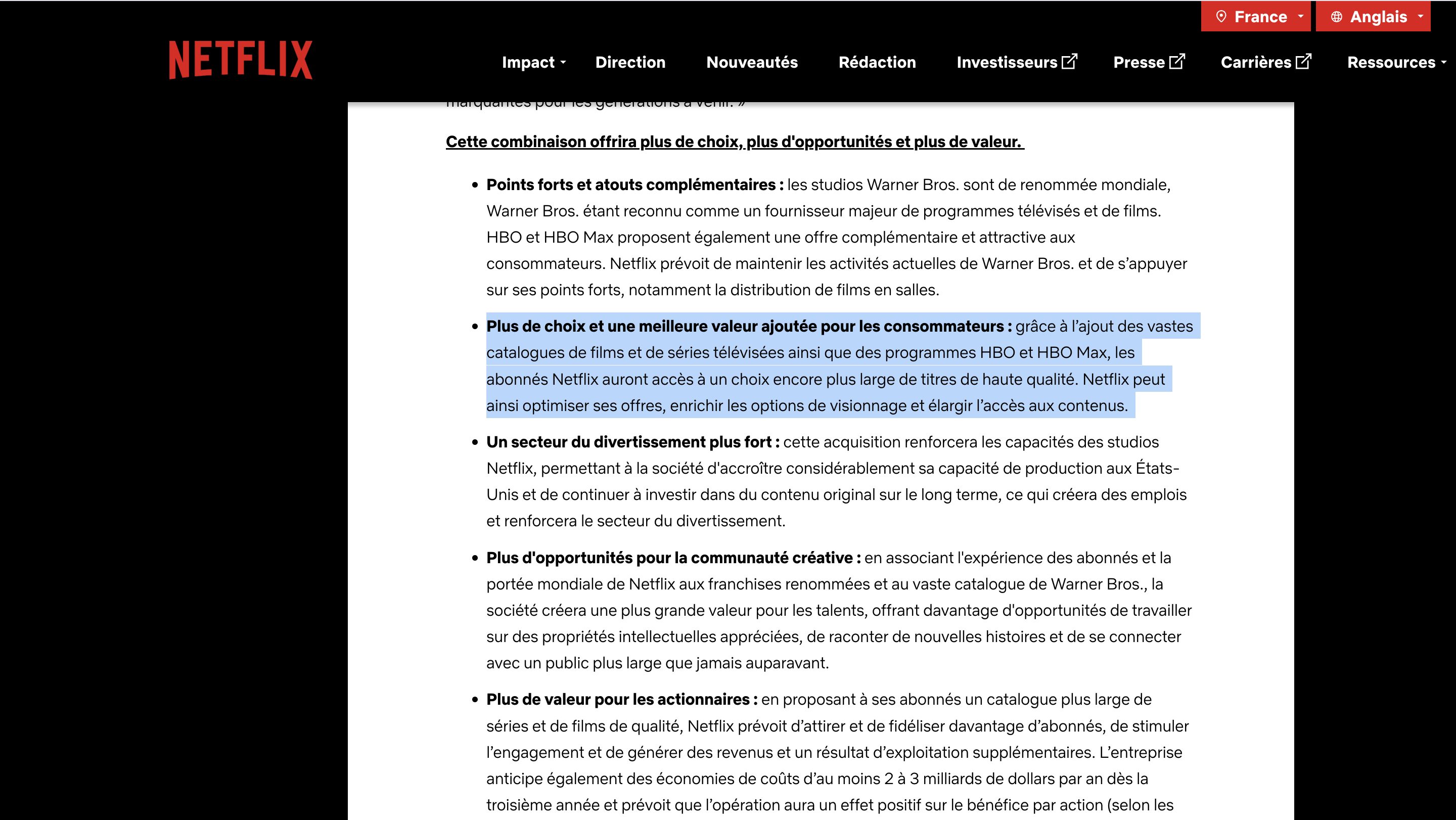 Pour rappel, trois scénarios principaux sont envisagés : le maintien de deux plateformes distinctes, un « bundle » facturé en supplément, ou une fusion franche en une seule plateforme. Le communiqué officiel publié le 5 décembre 2025 laisse d’ailleurs entendre que Netflix souhaite intégrer les contenus HBO directement à son abonnement. Dans la partie consacrée aux points forts de l’acquisition, les entreprises promettent ainsi que « grâce à l’ajout des vastes catalogues de films et de séries télévisées ainsi que des programmes HBO et HBO Max, les abonnés Netflix auront accès à un choix encore plus large de titres de haute qualité ». Elles ajoutent que cette intégration permettra à Netflix « d’optimiser ses offres, d’enrichir les options de visionnage et d’élargir l’accès aux contenus ». La forme exacte que prendrait cette intégration massive n’a toutefois pas encore été précisée.