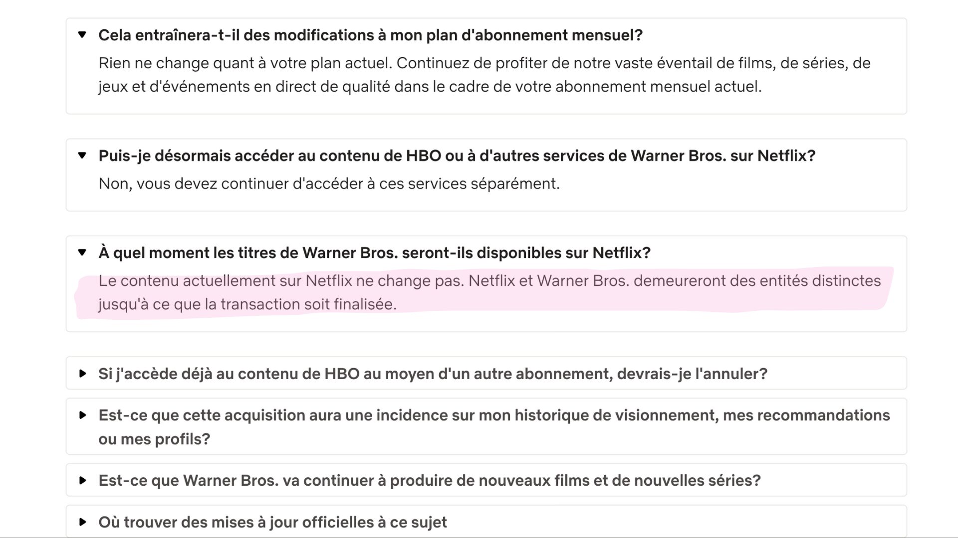 Ce calendrier est crucial : une fois ce délai passé, les deux services pourraient être amenés à fusionner. Sur sa page FAQ dédiée à l’opération, Netflix répond à la question « À quel moment les titres de Warner Bros. seront-ils disponibles sur Netflix ? » par une formulation très suggestive : « Le contenu actuellement sur Netflix ne change pas. Netflix et Warner Bros. demeureront des entités distinctes jusqu’à ce que la transaction soit finalisée ». Sous-entendu : après finalisation, une fusion serait plus qu’envisageable. Pour ne pas dire logique.